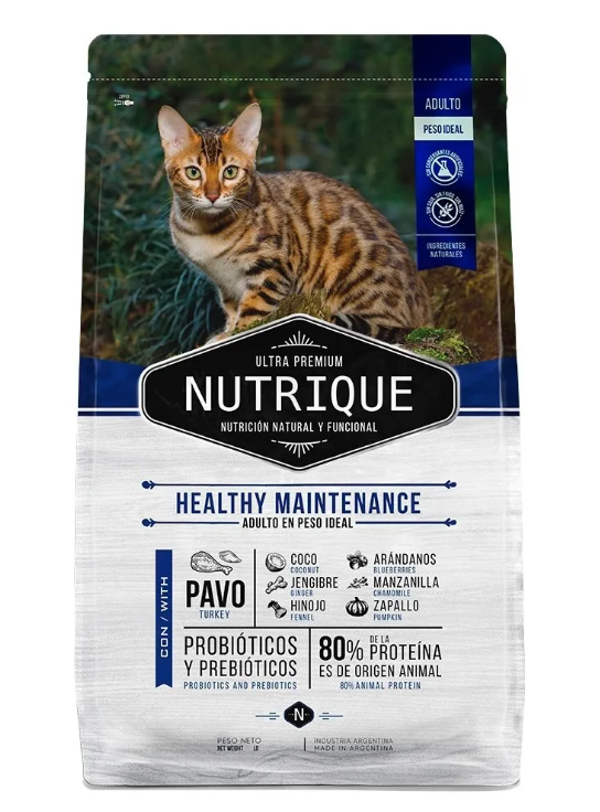 Harina de pavo, arroz, hidrolizado de hígado porcino deshidratado, cebada, aceite de pollo, arvejas secas, pulpa de remolacha, avena, celulosa en polvo, coco deshidratado, aceite de pescado, aceite de coco, zapallo deshidratado, semillas de chía, tomate deshidratado en polvo, sal, taurina, probióticos (Saccharomyces cerevisiae, Enterococcus faecium, Lactobacillus acidophilus), extracto de manzanilla, jengibre en polvo, hinojo, menta molida, arándonos rojos (cranberries), extracto de romero, arándanos liofilizados (blueberries), extractos vegetales naturales (té verde), aceite de raya, fructooligosacáridos, hexametafosfato de sodio, Vitaminas: A, C, D3, E, B1, B2, B6, B12, biotina, ácido fólico, niacina, ácido pantoténico, cloruro de colina. Minerales: hierro, cobre, zinc, selenio, manganeso, yodo, calcio.