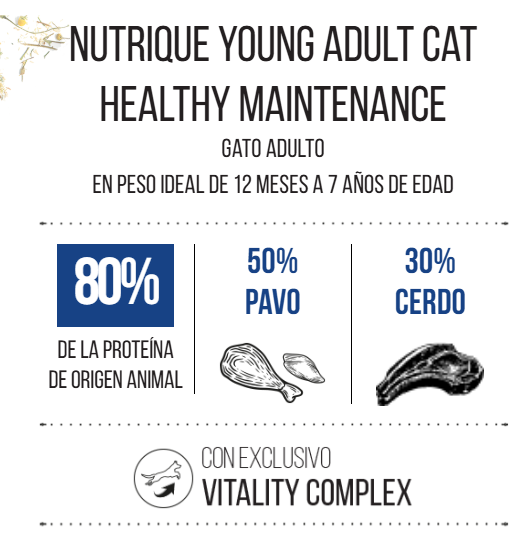 - Blend de Aceites: Un blend de aceites con propiedades nutricionales únicas para el gato adulto joven.