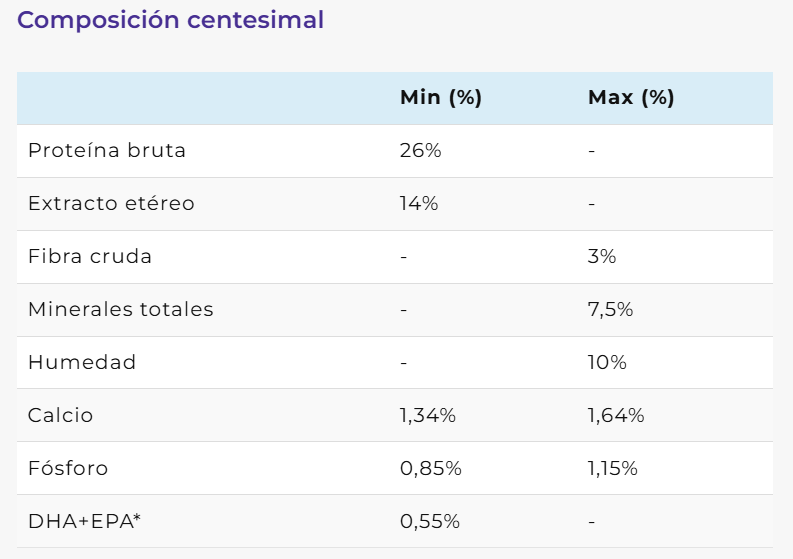 Harina de pavo, arroz, hidrolizado de hígado porcino deshidratado, cebada, aceite de pollo, arvejas secas, pulpa de remolacha, avena, aceite de pescado, aceite de coco, coco deshidratado, semillas de chía, cloruro de potasio, sal, probióticos, extracto de manzanilla, jengibre en polvo, hinojo, extracto de romero, arándanos liofilizados (blueberries), extractos vegetales naturales (té verde), glucosamina, aceite de raya, condroitín sulfato, fructooligosacáridos. Vitaminas: A, C, D3, E, B1, B2, B6, B12, ácido fólico, niacina, ácido pantoténico, cloruro de colina. Minerales: hierro, cobre, zinc, selenio, manganeso, yodo, calcio.