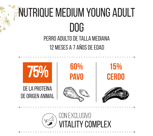 - Blend de Aceites: con propiedades nutricionales únicas, ideal para el perro adulto joven.