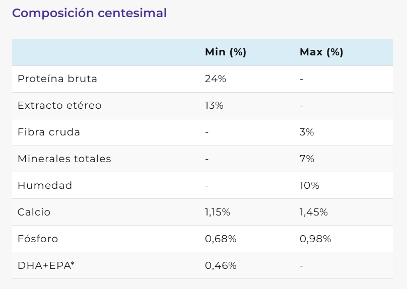 Harina de pavo, arroz, arroz integral, cebada, arvejas secas, aceite de pollo, pulpa de remolacha, semillas de chía, hidrolizado de hígado porcino deshidratado, aceite de coco, aceite de pescado, coco deshidratado, zapallo deshidratado, probióticos, extracto de manzanilla, jengibre en polvo, hinojo, extracto de romero, arándanos liofilizados (blueberries), extractos vegetales naturales (té verde), aceite de raya, fructooligosacáridos, hexametafosfato de sodio. Vitaminas: A, C, D3, E, B1, B2, B6, B12, ácido fólico, niacina, ácido pantoténico, Minerales: hierro, cobre, zinc, selenio, manganeso, yodo, calcio.