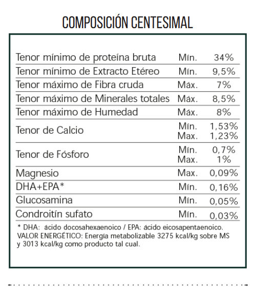 Harina de pavo, hidrolizado de hígado porcino deshidratado, arroz, arroz integral, celulosa en polvo, cebada, arvejas secas, pulpa de remolacha, Vitacel Psyllium, avena, aceite de pollo, coco deshidratado, aceite de pescado, zapallo deshidratado, semillas de chía, tomate deshidratado en polvo, aceite de coco, sal, taurina, probióticos (Saccharomyces cerevisiae, Enterococcus faecium, Lactobacillus acidophilus), arándanos rojos (cranberries), extracto de manzanilla, jengibre en polvo, hinojo, extracto de romero, menta molida, arándanos liofilizados (blueberries), extractos vegetales naturales (té verde), aceite de raya, glucosamina, condroitín sulfato, L-carnitina, fructooligosacáridos, hexametafosfato de sodio. Vitaminas: A, C, D3, E, B1, B2, B6, B12, biotina, ácido fólico, niacina, ácido pantoténico, cloruro de colina. Minerales: hierro, cobre, zinc,selenio, manganeso, yodo, calcio.