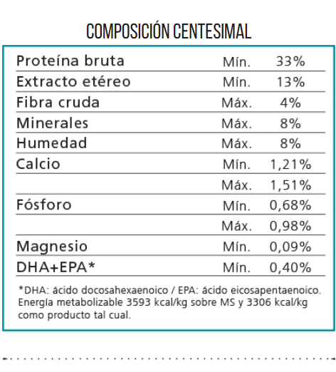 Harina de pavo, arroz, hidrolizado de hígado porcino deshidratado, arvejas secas, cebada, aceite de pollo, pulpa de