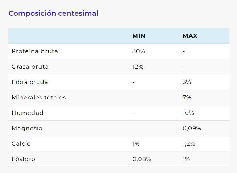 Harina de pollo, arroz, gluten meal, maíz, harina de soja micronizada, aceite de pollo, trigo, hidrolizado proteico de pollo, pulpa de remolacha (fuente de fructooligosacáridos FOS), aceite de pescado, levadura de cerveza, sal, celulosa en polvo, bisulfato de sodio, metionina, lisina, zeolita, inulina, vitaminas: A, D3, E, K3, B1, B2, B6, B12, biotina, ácido fólico, ácido nicotínico, ácido pantoténico, vitamina C, minerales inorgánicos (iodato de calcio, sulfato ferroso, óxido manganoso), minerales quelados, (cobre como metioninato de cobre, selenio como levadura enriquecida, zinc como propionato de zinc), cloruro de potasio, taurina, sorbato de potasio, nucleótidos de levadura, colina, paredes de levadura (fuente de manano-oligosacáridos MOS), extracto de Yucca schidigera, antioxidantes (extracto de romero, BHA, BHT) y polifenoles,