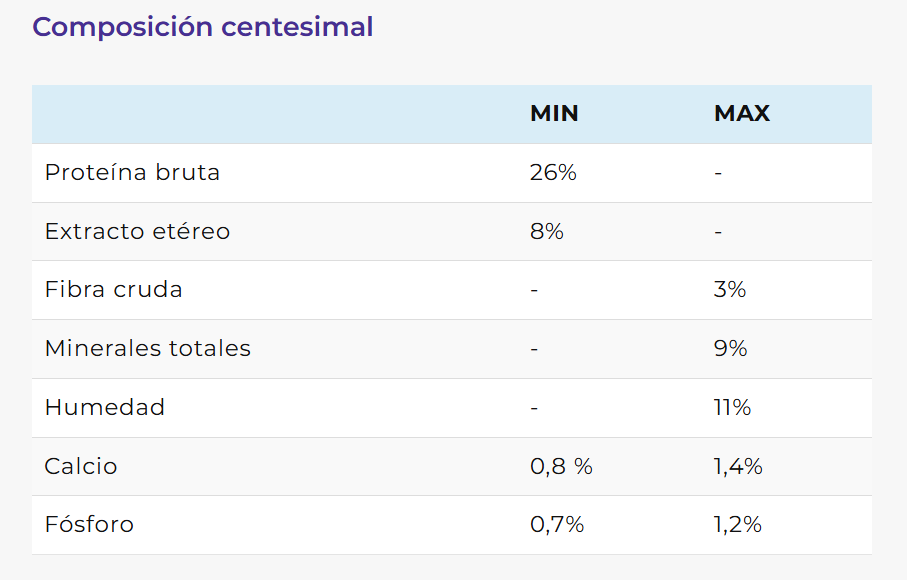 Harina de pollo, trigo, harina de carne, arroz, gluten meal, maíz, harina de soja micronizada, pulpa de remolacha (fuente de fructooligosacáridos -FOS-), hidrolizado proteico de pollo, aceite de pollo, aceite de pescado, levadura de cerveza, zeolita, sal, vitaminas: A, D3, E, K3, B1, B2, B6, B12, biotina, ácido fólico, ácido nicotínico, ácido pantoténico, vitamina C, minerales inorgánicos (iodato de calcio, sulfato ferroso, óxido manganoso, sulfato de manganeso), minerales quelados (cobre como metioninato de cobre, selenio como levadura enriquecida, zinc como propionato de zinc), inulina, colina, extracto de Yucca schidigera, L- carnitina, sorbato de potasio, paredes de levadura (fuente de mananooligosacáridos -MOS-), nucleótidos de levadura, hexametafosfato de sodio, antioxidantes (extracto de romero, BHA, BHT) y polifenoles; metionina, lisina, taurina, glucosamina y metilsulfonilmetano.