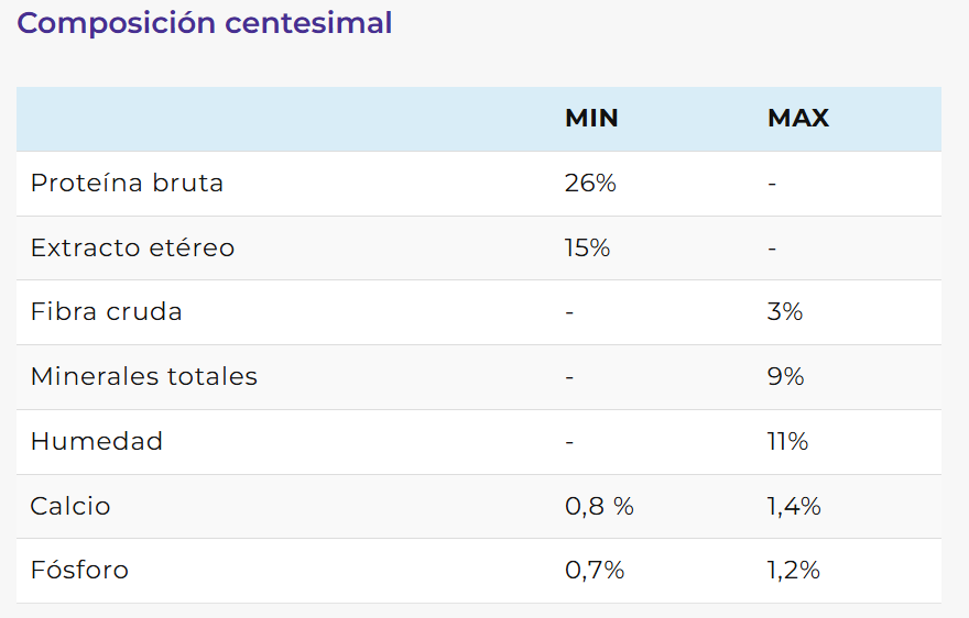 Harina de pollo, trigo, harina de carne, arroz, aceite de pollo, gluten meal, maíz, harina de soja micronizada, pulpa de remolacha (fuente de fructooligosacáridos FOS), hidrolizado proteico de pollo, aceite de pescado, levadura de cerveza, huevo en polvo, leche en polvo, zeolita, sal, vitaminas: A, D3, E, K3, B1, B2, B6, B12, biotina, ácido fólico, ácido nicotínico, ácido pantoténico, vitamina C, minerales inorgánicos (iodato de calcio, sulfato ferroso, óxido manganoso), minerales quelados (cobre como metioninato de cobre, selenio como levadura enriquecida, zinc como propionato de zinc), inulina, colina, extracto de Yucca schidigera, antioxidantes (extracto de romero, BHA, BHT) y polifenoles, sorbato de potasio, paredes de levadura (fuente de manano-oligosacáridos MOS), nucleótidos de levadura, glucosamina, lisina y metionina.