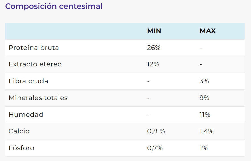 Harina de pollo, trigo, harina de carne, arroz, gluten meal, maíz, harina de soja micronizada, aceite de pollo, pulpa de remolacha (fuente de fructooligosacáridos -FOS-), hidrolizado proteico de pollo, aceite de pescado, levadura de cerveza, zeolita, sal, vitaminas: A, D3, E, K3, B1, B2, B6, B12, biotina, ácido fólico, ácido nicotínico, ácido pantoténico, vitamina C, minerales inorgánicos (iodato de calcio, sulfato ferroso, oxido manganoso, sulfato de manganeso) minerales quelados (cobre como metioninato de cobre, selenio como levadura enriquecida, zinc como propionato de zinc), inulina, colina, extracto de Yucca schidigera, sorbato de potasio, paredes de levadura (fuente de mananooligosacáridos -MOS-), nucleótidos de levadura, antioxidantes (extracto de romero, BHA, BHT) y polifenoles, taurina, glucosamina, hexametafosfato de sodio, L-carnitina, metilsulfonilmetano, lisina y metionina.