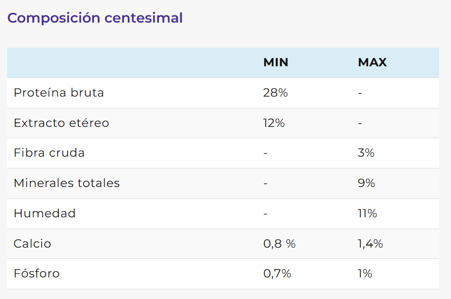 Harina de pollo, trigo, harina de carne, arroz, gluten meal, maíz, harina de soja micronizada, aceite de pollo, pulpa de remolacha (fuente de fructooligosacáridos FOS), hidrolizado proteico de pollo, aceite de pescado, levadura de cerveza, zeolita, sal, vitaminas: A, D3, E, K3, B1, B2, B6, B12, biotina, ácido fólico, ácido nicotínico, ácido pantoténico, vitamina C, minerales inorgánicos (iodato de calcio, sulfato ferroso, óxido manganoso, sulfato de manganeso) minerales quelados (cobre como metioninato de cobre, selenio como levadura enriquecida, zinc como propionato de zinc), inulina, colina, extracto de Yucca schidigera, sorbato de potasio, paredes de levadura (fuente de manano-oligosacáridos MOS), nucleótidos de levadura, antioxidantes (extracto de romero, BHA, BHT) y polifenoles, taurina, glucosamina, hexametafosfato de sodio, L-carnitina, metilsulfonilmetano, lisina y metionina.