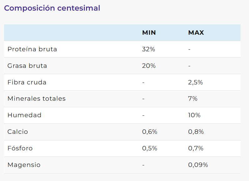 - Digestive system: ingredientes de alta digestibilidad como almidón de mandioca, pollo y huevo aportan energía y proteínas de alto valor biológico. Formulado con moderado contenido de grasa y altos niveles de Omega 3 de acción antiinflamatoria, que mejoran el proceso digestivo.