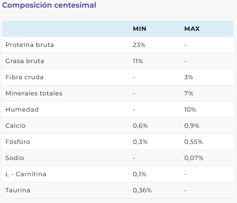 - Heart Performance: bajo nivel de sodio y aporte controlado de potasio para compensar eventuales pérdidas por el uso de diuréticos. La presencia de taurina y L-carnitina colaboran con la protección y el funcionamiento del músculo cardíaco.