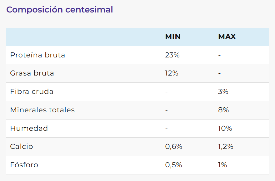 - Hydrolyzed protein: proteína hidrolizada de bajo peso molecular de alta digestibilidad, que colabora en el control de reacciones alérgicas.