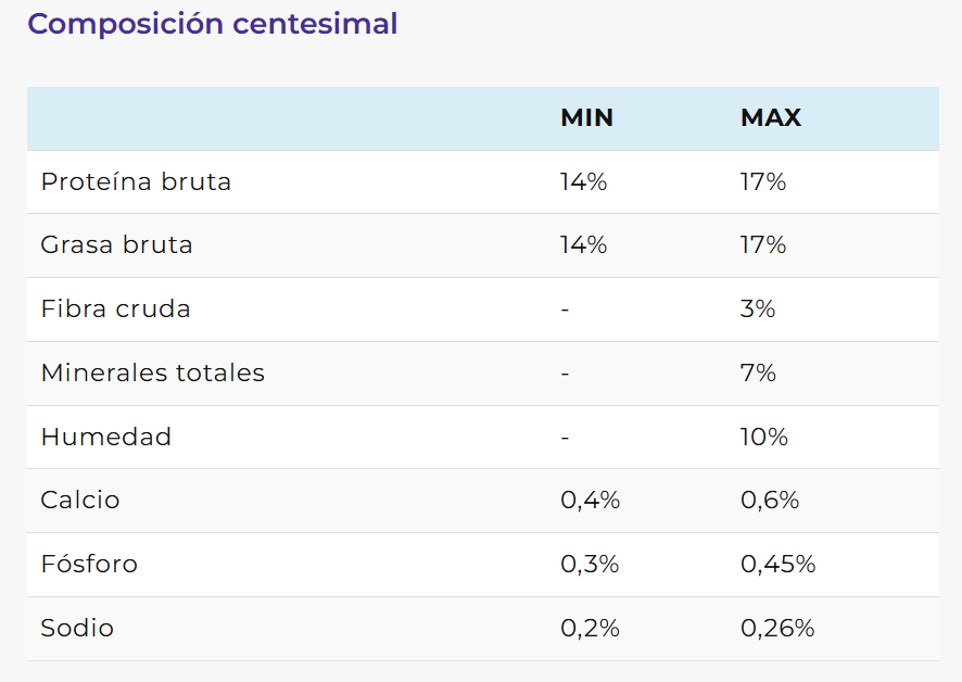 - High quality protein: aporta una moderada cantidad de proteínas de alto valor biológico y digestibilidad, provenientes del pollo y huevo, que minimizan el catabolismo proteico.