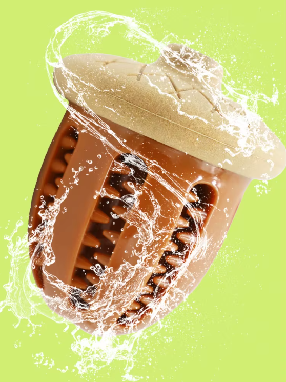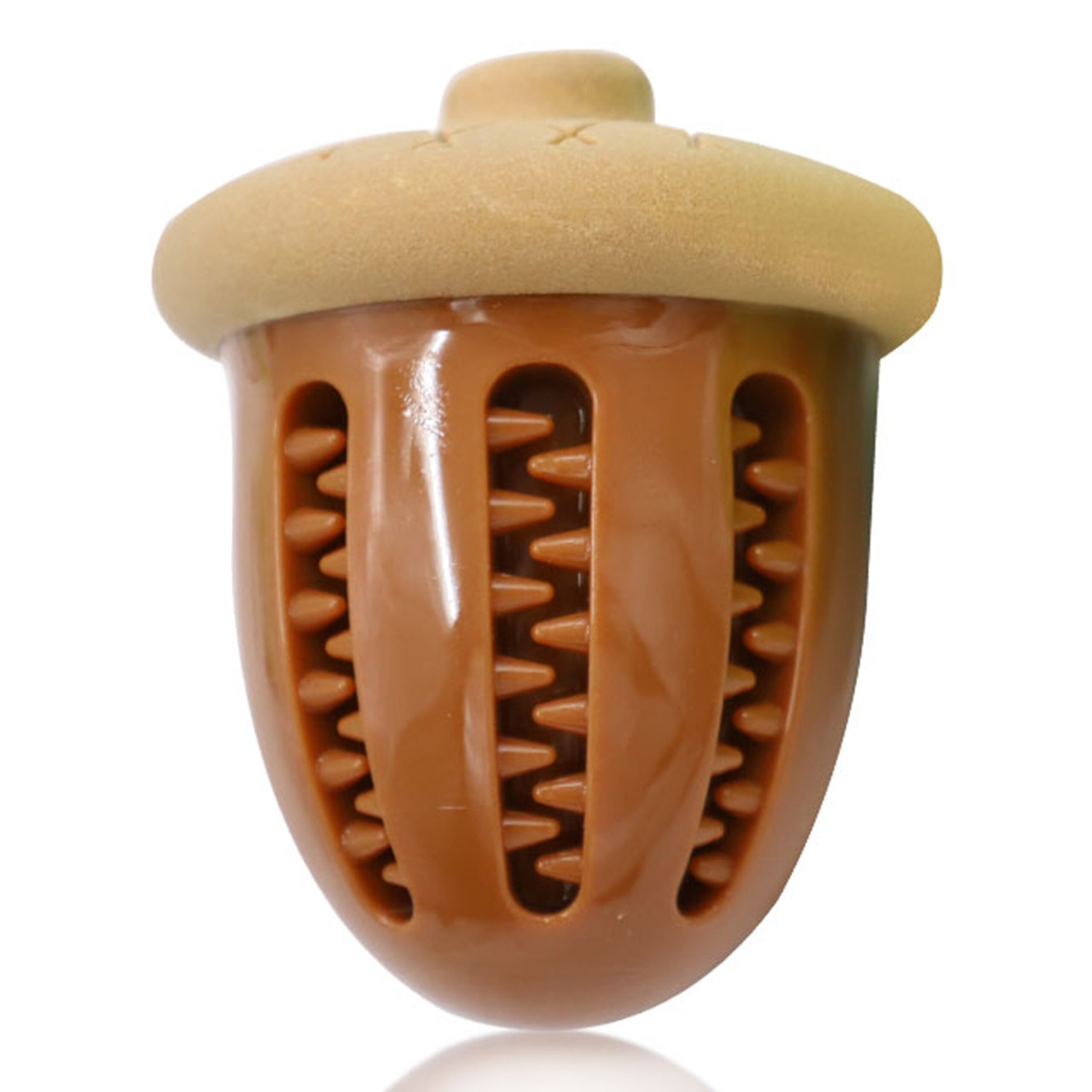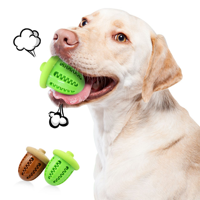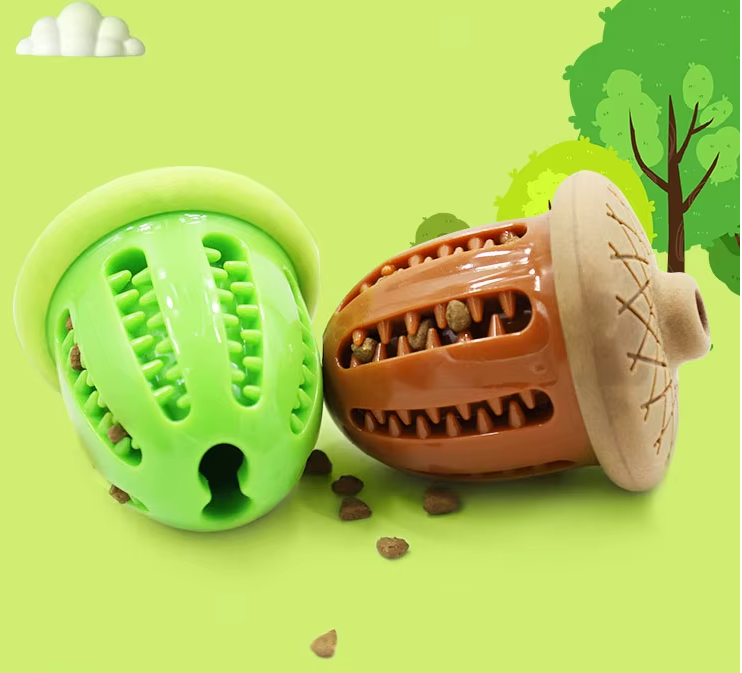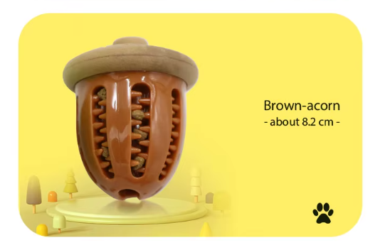 Este juguete interactivo para perros con forma de bellota, hecho de TPR resistente y seguro para morder, diseñado para brindar entretenimiento, estimulación mental y cuidado dental. Incluye un orificio que permite rellenarlo con snacks o pasta para perros, ofreciendo un desafío divertido que mantiene a tu perro entretenido y ayuda a reducir los niveles de estrés y ansiedad. Es perfecto para morder, lanzar y jugar. Las hendiduras en su superficie ayudan a limpiar los dientes y masajear las encías mientras el perro juega, contribuyendo a una mejor higiene bucal. Ideal para prevenir el aburrimiento y mantener la boca de tu perro saludable.