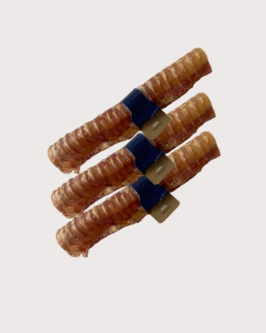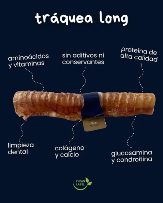 Una opción excelente para perros de gran tamaño o con mandíbulas fuertes. La tráquea larga es más resistente y sabrosa, perfecta para entretener y cuidar.
