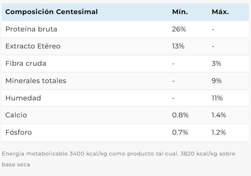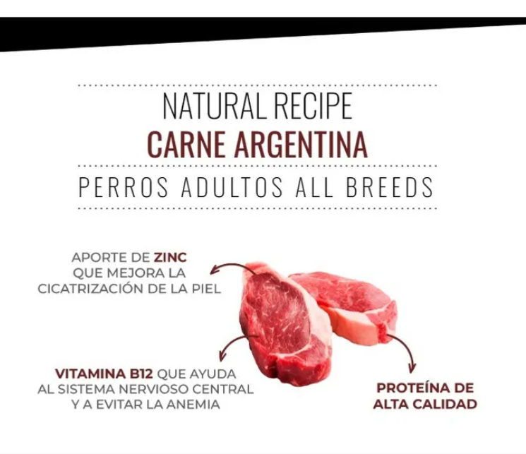 Carne argentina seleccionada, harina de carne y hueso bovino, arroz, arvejas, gluten meal, aceite de pollo, pulpa de remolacha, hidrolizado de menudencias de ave, aceite de pescado, levadura de cerveza, zeolita, sal, inulina, extracto de Yucca schidigera, antioxidantes naturales (extracto de romero, lecitina, tocoferoles), polifenoles, ácido propiónico, paredes de levadura, glucosamina, metilsulfonilmetano, nucleótidos de levadura, hexametafosfato de sodio. Vitaminas: A, D3, E, K3, B1, B2, B6, B12, colina, biotina, ácido fólico, ácido nicotínico, ácido pantoténico, vitamina C. Minerales: yodo, hierro, manganeso, cobre, selenio y zinc.